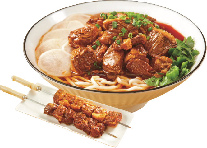 Delicious hand pulled noodles with the perfect generous amount of Beef Short ribs accompanied by Beef Skewers.